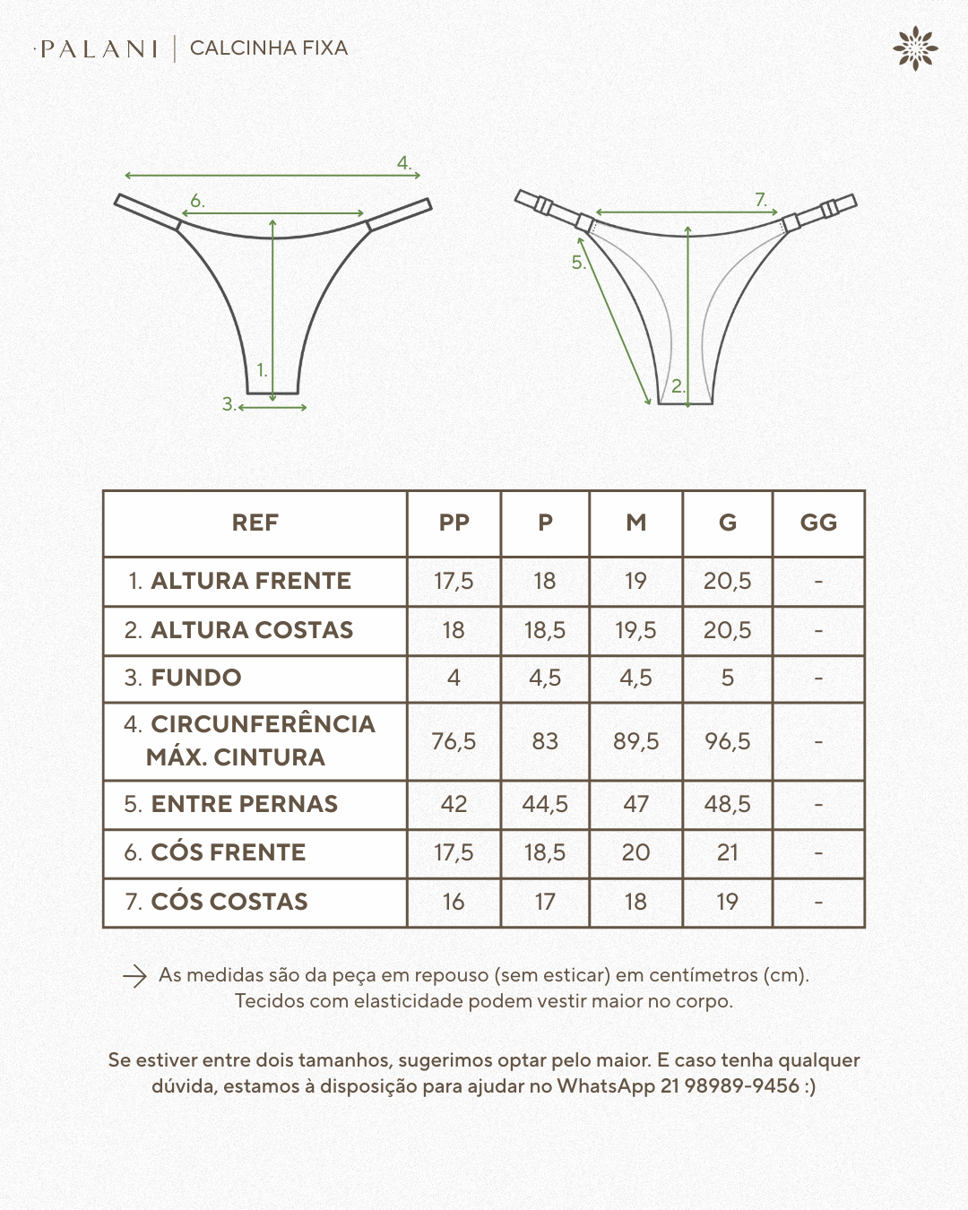 OBSERVAÇÃO: Você pode adquirir o Top e a Calcinha em tamanhos diferentes para um caimento ideal. Em caso de dúvida entre dois tamanhos, recomendamos optar pelo maior para maior conforto e evitar apertos.