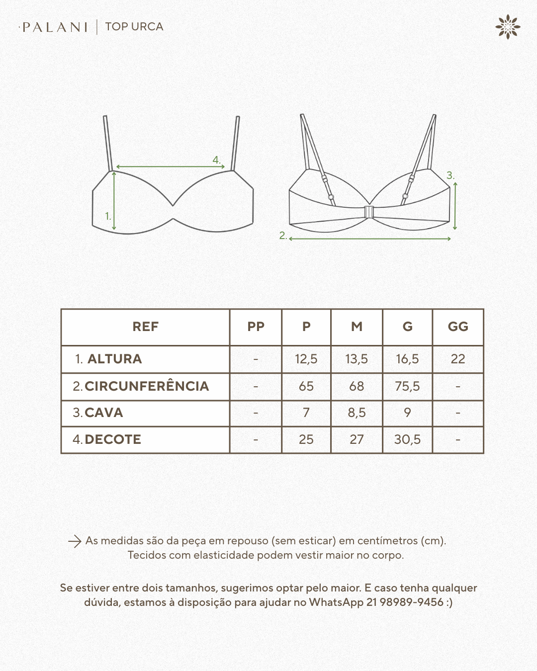OBSERVAÇÃO: Você pode adquirir o Top e a Calcinha em tamanhos diferentes para um caimento ideal. Em caso de dúvida entre dois tamanhos, recomendamos optar pelo maior para maior conforto e evitar apertos.