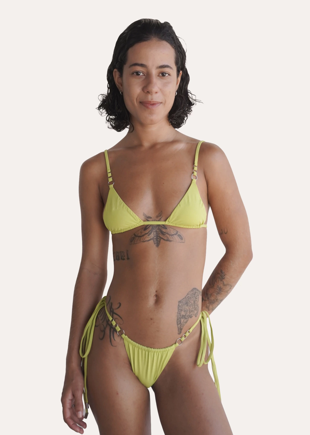 The Zenith Bottom in the shade Vigor was designed to follow your movement with comfort and confidence. It is a refined reinterpretation of our classic adjustable style, with a practical twist: the front panel is secured with a reinforcement stitch, ensuring the ruching stays perfectly in place and the coverage doesn’t close while wearing. The artisanal touch appears in the triple-ring hardware and the detailed cord ends on the side ties, creating a lightweight and sophisticated look in all the right ways.